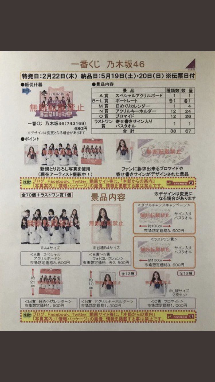 18年のセブンイレブン一番くじ 乃木坂ロットすべてです ロット買いで段ボールに入ったままになっており個々の写真はございません。 ロットでかっておりますので、POP等もすべてあります。セール・キャンペーン 『東京リベンジャーズ』キャンペーン 対象商品を買うとクリアファイルもらえる クイズに正解してボディメンテを貰おう! 対象ドリンク一度に2本買うと2本目半額! プライチ気になる対象商品はこちら!